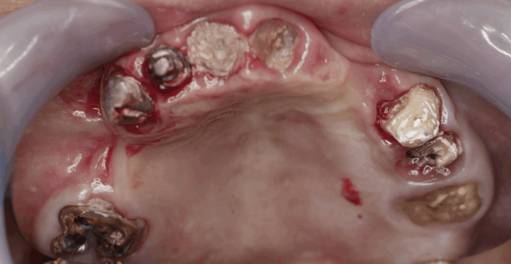 善用既有資源: 將上顎左側十五年前穩固的兩顆舊植體上方的假牙拆卸下來,確認植體健康無虞。這兩顆歷經考驗的植體,成為重建計畫中寶貴的「強力支柱」。